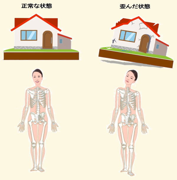 身体も同じで土台である骨盤が歪むと背骨にも歪みが生じ、身体のバランスが崩れてしまいます。
