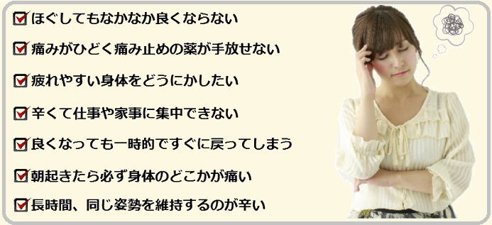 今までに痛みが出ている部分に直接、施術を受けて一時的に気にならなくなっても、すぐ元に戻ってしまっていた方は、その部分が原因ではなかった可能性があります。