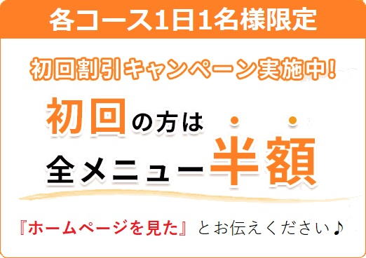 各コース1日1名様限定で初回カウンセリング料1,000円をプラスした施術料金より半額のお試し料金(通常コースの場合:初回通常6,000円⇒3,000円)で施術させていただきます。