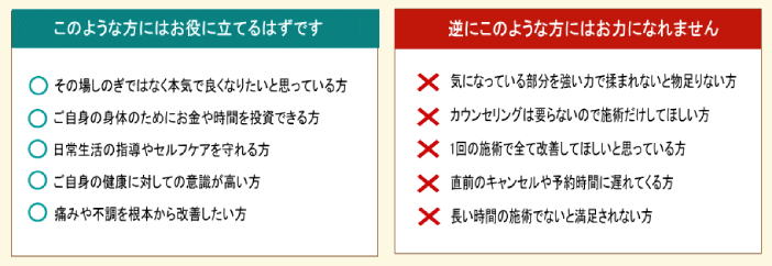 もし当店の施術を受けて全く効果が感じられない場合は遠慮なく、その場でお申し出いただければ料金をいただきません。