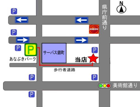 | 駐車場までの道案内 | 当店(県庁前通り)より1本西側の通りにある、あなぶきパーク錦町9さんが提携しているコインパーキングです。 そちらに車を停めていただいてから案内図にある歩行者道路を通って来ていただけると近道になります。 |