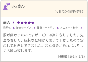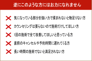 もし当店の施術を受けて全く効果が感じられない場合は遠慮なく、その場でお申し出いただければ料金をいただきません。
