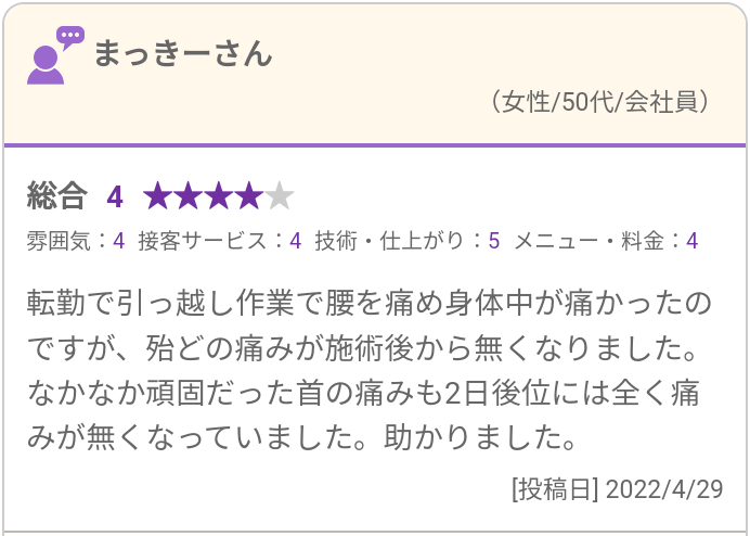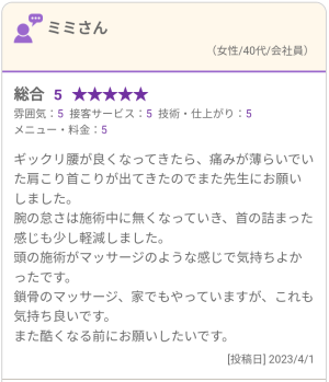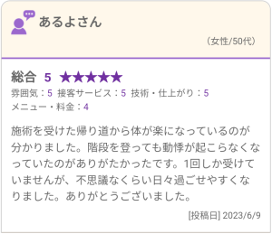 もし当店の施術を受けて全く効果が感じられない場合は遠慮なく、その場でお申し出いただければ料金をいただきません。
