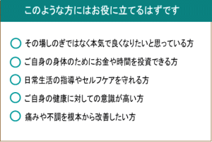 それは、症状を引き起こしている原因になっているであろう生活習慣などを見直すことで施術効果が持続し、改善のスピードも早めることができるからです。